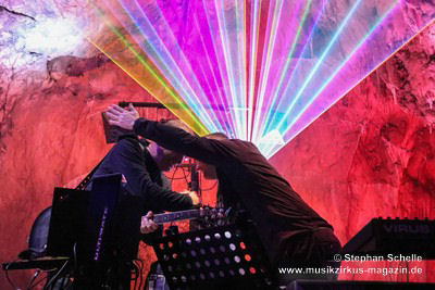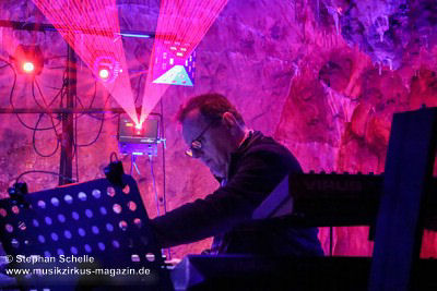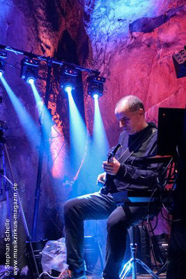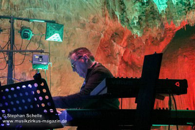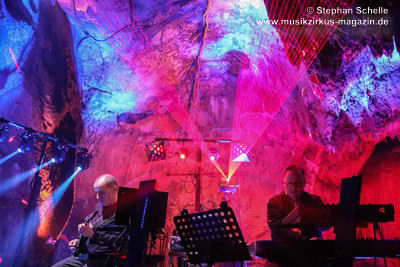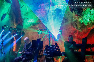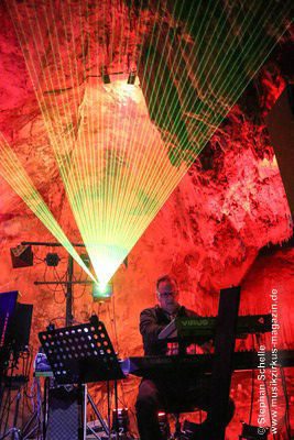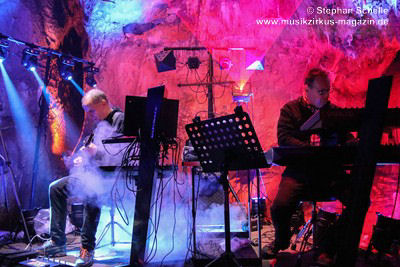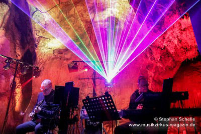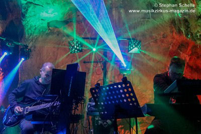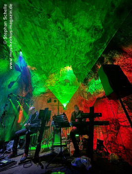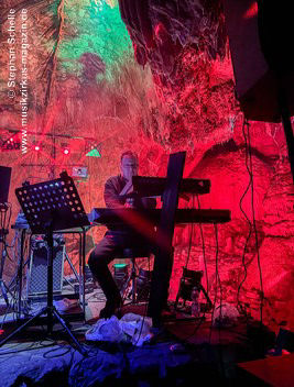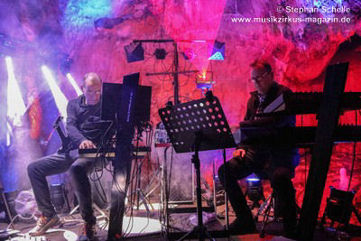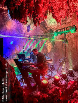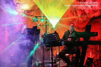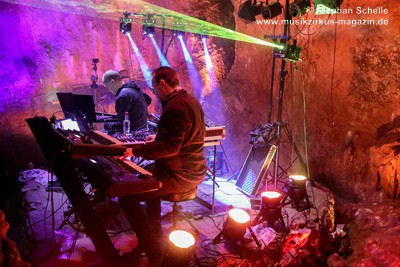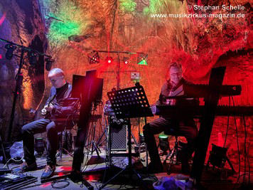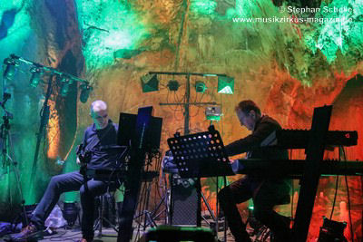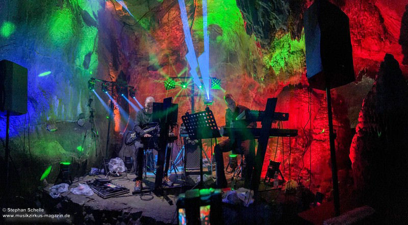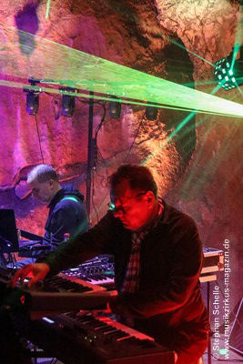 Nahtlos schloss sich dann „Out In The Cold“ an, das die Beiden zusammen in einer Session in der Rhön aufgenommen haben. Sie hatten sich vor gut drei Jahren ein Haus in der Rhön gemietet und dort ihre Instrumente aufgebaut. Nachdem sie zunächst durch den tiefen Schnee gewandert waren, hatten sie sich dann nachmittags an ihre Geräte gesetzt und losgejammt. Dabei sind einige Stücke entstanden, die sie als Sonic Transients unter dem Titel „The Rhoentapes“ bei Bandcamp veröffentlicht haben. „Out In The Cold“ war sehr atmosphärisches Stück mit sanftem Rhythmus, das zum Träumen anregte. Und nahtlos ging es dann auch gleich mit dem unveröffentlichten Track „Nightglow“ weiter, bei dem die Klänge förmlich durch die Kanzelgrotte schwebten.