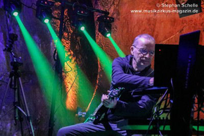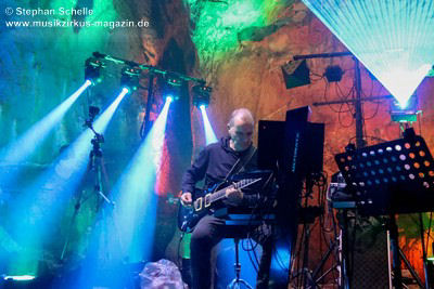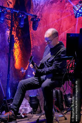 Nach diesem ruhigen Stück kam dann eine druckvolle Version des Pyramid Peak-Stücks „Flowing With Birds“ an die Reihe. Wie Axel erklärte, hatte Max die CD „Caveland“ in die Hände bekommen und das Stück „umgebastelt“. Das gefiel ihnen so gut, dass sie es unbedingt live spielen wollten. Max hat dieses Stück (in der Liveversion fast doppelt so lang) mit herrlichen Gitarrenparts bzw. -soli versehen und es so auf eine neue Ebene gehoben. Hier traf atmosphärischer Rock auf elektronische Musik. Diese Version war eines der Highlights des Konzertes.