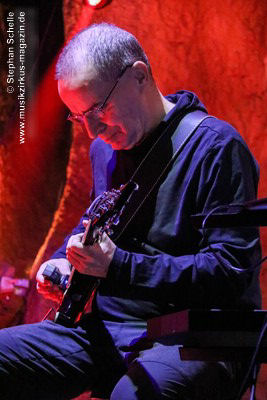 Während Axel Stupplich seine Keyboards bediente, spielte Max Schiefele die meiste Zeit E-Gitarre inkl. zahlreicher Effekte sowie teilweise Keyboard. Max agierte – bis auf die letzte Zugabe – recht zurückhaltend und sphärisch an seiner E-Gitarre. Dabei setzte er ein ums andere Mal auch den E-Bow ein. Das ist ein handliches Kunststoffgehäuse, in dem ein Magnetfeld die Saiten der Gitarre zum Schwingen bringt. Dadurch entsteht ein lang anhaltender, gleichmäßiger Ton, was perfekt zu den elektronischen Klängen der Beiden passte.
