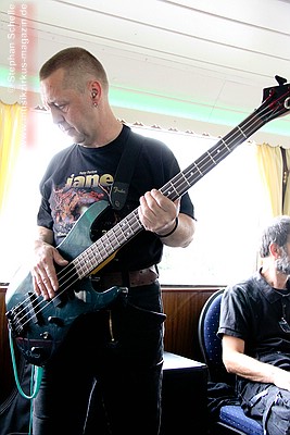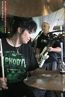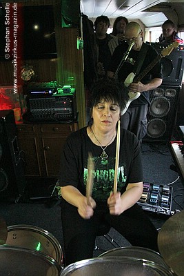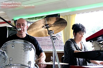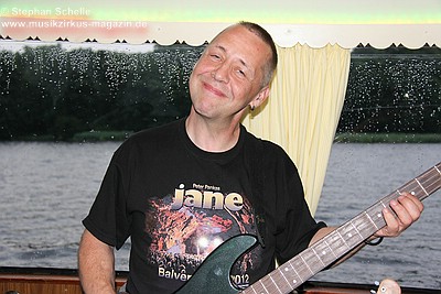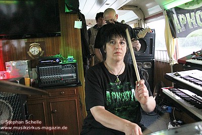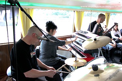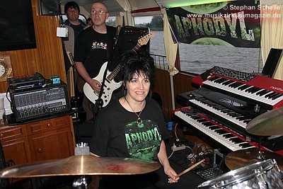 Bei „Hypnotic“ ließ Bine ihre Keyboardsounds durch den Raum unter Deck des Schiffes - in ihrer unnachahmlichen Art - fliegen. Und auch Andre geizte nicht mit herrlichen Soli während die Rhythmusgeber Arno und Holli für einen kraftvollen Unterbau sorgten. Es ist kaum zu beschreiben wie die Musik wirkte, während sich das Schiff seinen Weg durch die Wassermassen bahnte. Eine wahre hypnotische Wirkung machte sich breit, die einem die Sinne zu rauben schien, während man im Ohr die Klänge hatte und vor dem Auge die herrliche Landschaft der Havelgegend vorbeizog. Gut 100 Reisende begleiteten Aphodyl so auf einem unglaublichen Trip durch die Berliner Havellandschaft mit ihren am Ufer bebauten teils feudalen Gebäuden und wunderbaren Grünflächen. Ein wahres Erlebnis, das sich da vor den Augen und Ohren der Gäste vollzog, die gut 6 Stunden in Partystimmung verweilten.