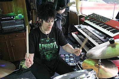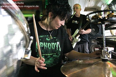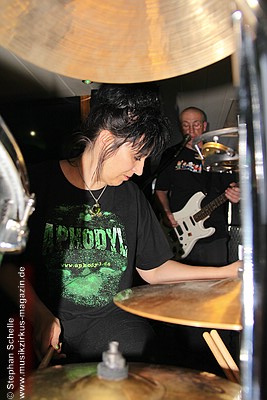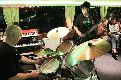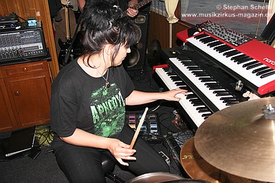 Das dritte Set, zu dem die Band nun ihre Instrumente umgebaut hatte, begann dann mit „Pain“. Bine war nun hinter das Schlagzeug gerückt, während Holli die zweite E-Gitarre spielte. Bine vollführte in diesem Set wieder das Kunststück gleichzeitig Schlagzeug und Keyboard zu spielen. Es ist immer wieder ein Erlebnis ihr bei dieser Einlage zuzusehen. Es folgten weitere Stücke, bei denen das Publikum ordentlich abrockte, während sich draußen langsam die Nacht breit machte.