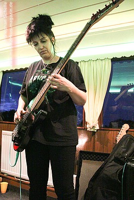 Das war aber noch nicht ganz der krönende Abschluss eines berauschenden Konzertereignisses, denn es folgte noch ein Medley der UFO-Stücke „Prince Kajuku“, „Boogie“ und „…“, das Sabine, Andre und Holli als SAH (Anfangsbuchstaben der Vornamen) gaben. Hierzu wechselten die Musiker erneut die Instrumente. Während Holli wieder an hinter seine Schießbude Platz nahm wechselte Bine an den Bass und machte auch dort eine sehr gute Figur. Und auch Petrus hatte mittlerweile ein Einsehen, denn der Himmel klarte langsam auf und präsentierte einen schönen Abendhimmel, der so langsam aber sicher auf den Sommer hinwies, der eigentlich statt der etwas unterkühlten Wetterlage herrschen sollte. Aber auch so waren die Klänge auf der MS Heiterkeit dazu angetan, die Besucher zu aphodylisieren und sie in eine zufriedene, glückliche Stimmung zu versetzten. Wer eine der wenigen Karten ordern konnte - die Veranstaltung war schon seit geraumer Zeit ausgebucht - der konnte sich glücklich schätzen.