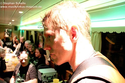 Beim Stück „Elektron“ sang Holli mit verfremdeter Stimme, was den rockig/popigen Song ein Flair von NDW verlieh. Irgendwie klang seine Stimme dabei völlig abgedreht und außerirdisch bzw. futuristisch. Zu diesem Zeitpunkt - es war gerade mal 18 Uhr - war die kleine Tanzfläche unter Deck bereits prall gefüllt und die Stimmung an Bord völlig ausgelassen. Und das blieb auch bis zum Ende des Ausfluges so. Das folgende „Cameltwist“ sorgte mit seinem Beat, der ein Flair von orientalischer Polka verströmte, für tolle Stimmung.