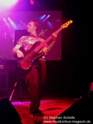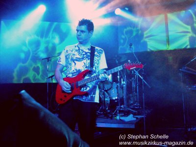 Die fünf ließen sich nicht von den wenigen Zuschauern abschrecken und legten eine Spielfreude an den Tag, die bemerkenswert war. Dabei wandelt John die ganze Zeit über barfüßig über die Bühne. Der erste Teil ihres Sets bestand aus einigen Stücken der aktuellen CD Contagion. Und so ging es auch gleich mit dem Opener der CD Witch Hunt mächtig los. Während des Stückes Butterfly Man schlich sich Rob Sowden ins Publikum. Ich bemerkte gar nicht, dass während ich gerade ein Foto von John Mitchell machte, sich Rob neben mich platziert hatte. Er ging dann singend durchs Publikum zurück auf die Bühne. Wie ich finde, eine sehr schöne Einlage.