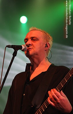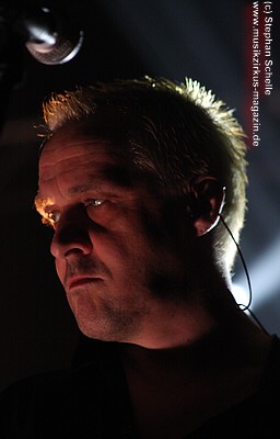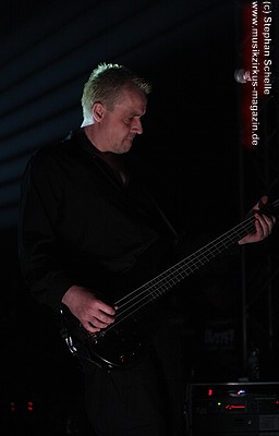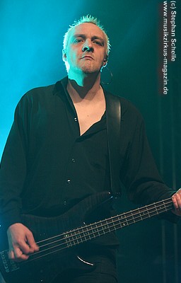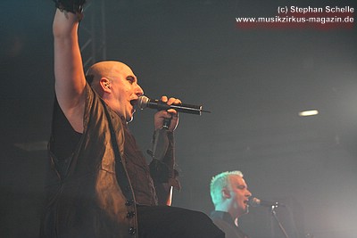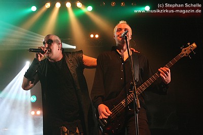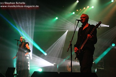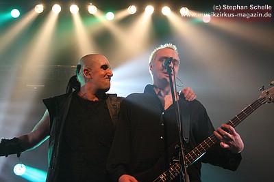 Auf dem Programm standen Stücke, die einen Querschnitt durch die bisherigen Veröffentlichungen boten. Da ich nicht viele Songs kenne, werde ich nur die nennen, die ich meine gehört zu haben. Einen Großteil der Songs findet man u. a. auf der 2008’er CD „Horror Vacui“, die ich an diesem Abend gekauft hab. Stilistisch hat die Band alles, was im Dark Wave/Gothic wichtig ist: harte Riffs, knackige Rhythmen (vom Schlagzeug und Bass), düstere Stimmung, markanter Gesang gewürzt mit elektronischen Sounds. Letztere sind vorprogrammiert, da die Band ohne Keyboarder auskommt.