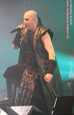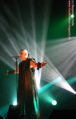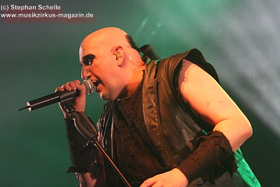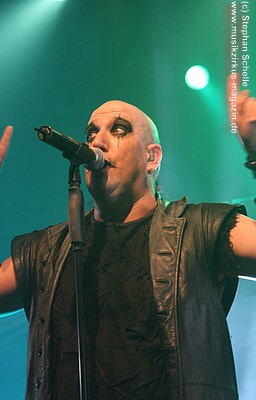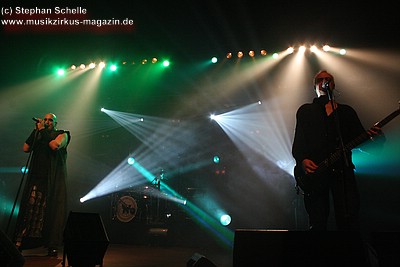 Während die Band auf der Bühne weitere Stücke wie „Sanctus Benedictus“, „Krabat”, „Raserei“, „Die kleine Ballade vom schwarzen Schmetterling“, „Biotopia“, „Nie mehr“ und „Kokon“ darbietet, wird die Bühne, die rauchgeschwängert ist, in tiefste Farben getaucht. Mal leuchtet sie blau, dann grün oder einfach feuerrot. Dazu durchschneiden teils langsam teils hektische Scheinwerferstrahlen die Luft der Turbinenhalle. Auch werden Blitzlicht artige Lichttiraden von der Bühne ins Publikum gesendet. Und zu den harten Riffs, den treibenden Rhythmen und eingängigen Melodien sieht man eine ganze Anzahl von Fans sanft hin und her bewegend tanzen.