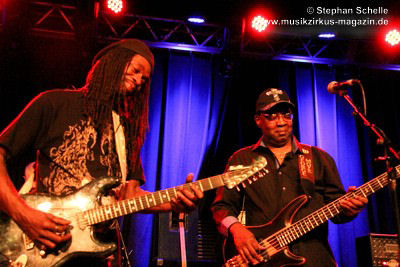 Los ging es aber erst einmal mit dem Instrumental „I’m Back“, bei dem die Richtung des Konzertes schon einmal vorgegeben wurde. Knackiger Bluesrock, bei dem sich schon zeigte, dass auf der Rhythmusmaschinerie von George Moye und Yoann die beiden Gitarristen Michael Goldschmidt (er spielte neben zahlreichen Rhythmusgitarrenparts auch einige eindrucksvolle Soli) und Bernard Allison (er stellte schon in diesem ersten Stück seine Fingerfertigkeit unter Beweis) in perfekter Abstimmung ganze Arbeit leisteten. Im Laufe des Konzertes legte Bernard Allison dann aber noch so manche Schippe drauf.