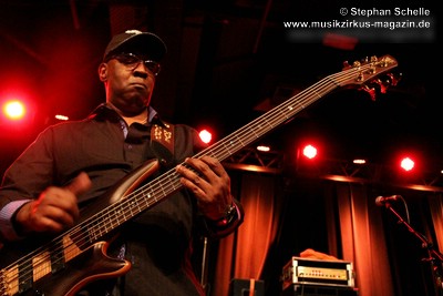 Danach versuchte Bernard im folgenden Instrumentalstück im wahrsten Sinne des Wortes einen Geschwindigkeitsrekord auf seiner E-Gitarre aufzustellen, denn er zog das Tempo im Verlauf der Melodie immer weiter an und steigerte sich in einen wahren Geschwindigkeitsrausch. Es war mehr als beeindruckend ihm dabei zuzusehen, mit welcher Leichtigkeit er über die Saiten seiner Gitarre fegte. Ein wahrer Profi an seinem Instrument. Dem schloss sich dann ein sehr druckvolles Solo von Yoann am Schlagzeug an, bei dem er seine ganze Klasse beweisen konnte. Da wurden nicht einfach technische Raffinessen aneinandergereiht, sondern das Solo war sehr melodisch angelegt und dramaturgisch gut aufgebaut. Dem folgte dann auch noch George Moye mit einem herrlichen Basssolo, bei dem er zeigte, warum man ihn auch Dr. Funk nennt. So baute er dann auch einige Passagen von Klassikern wie zum Beispiel Queen’s „Another One Bites The Dust“ in sein Solo ein.