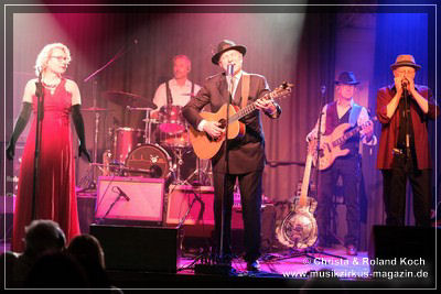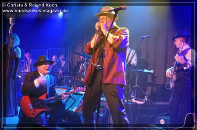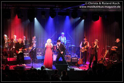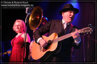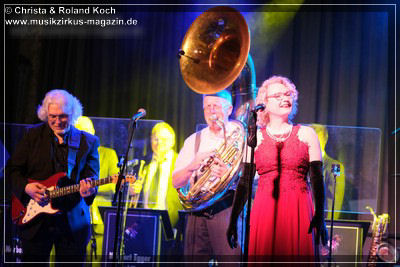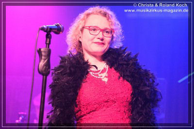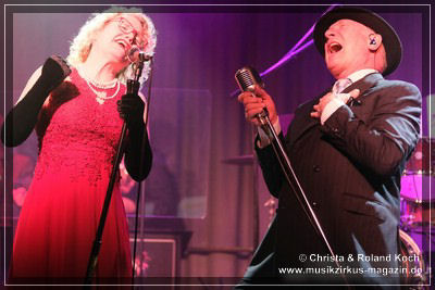 Auch beim Gesang wurden keinerlei Abstriche gemacht. Die beiden Hauptstimmen, weiblich Lydia Stone im signalroten Abendkleid (plus protzigen Perlenketten, schwarzer Federboa und edlen armlangen schwarzen Handschuhen) und männlich Norbert dazu stilecht im passenden Zweireiher und Al-Capone-Hut, werden ständig mehrstimmig aus dem Hintergrund kräftig und voluminös unterstützt. Es ist für ein abwechslungsreiches und vielfältiges Menü gesorgt und es ist ständig was los auf der proppenvollen Bühne.