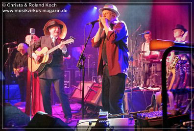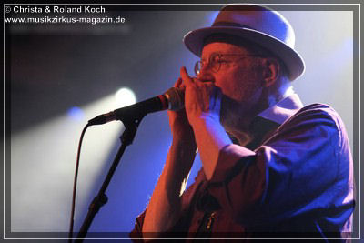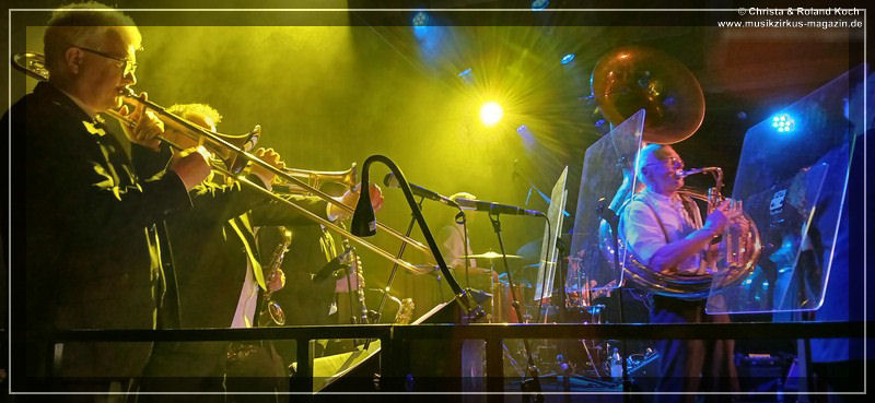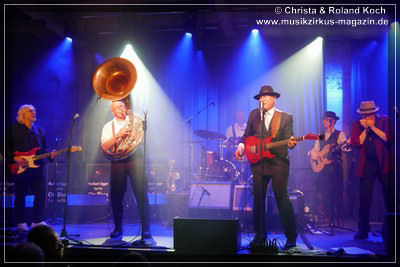 Die 2-stündige Blues-Reise hat Stopps in jedem Jahrzehnt der letzten einhundert Jahre, jede Epoche wird mit entsprechenden Kompositionen vorgestellt, gewürdigt, gefeiert, zelebriert. Norbert Egger hat sogar eine entfesselt aufspielende vierköpfige Bläser-Sektion; Kurt Gersdorf (Alt-Sax), Franz Neumeier (Bariton-Sax, musiziert auch bei Natural Blues und Berchtesgaden Blues Band), Harry Rehrl (Posaune), Markus Gorofsky (Trompete) sicher abgeschirmt hinter einem Plexi-Paravent; sowie mit dem Reichenhaller Hubert Grassl noch einen der wenigen deutschen Sousaphon-Spieler in das Magazin 3 gelockt. Mehr Authentizität geht fast nicht mehr. Doch, denn auch die britische Harmonika-Legende Steve Baker ließ es sich nicht nehmen, seinen alten Weggefährten aus der Hamburger Zeit Anfang der 80er, wieder einmal für mitreißende Duelle und Solis hier vor vollem Hause zu begleiten.