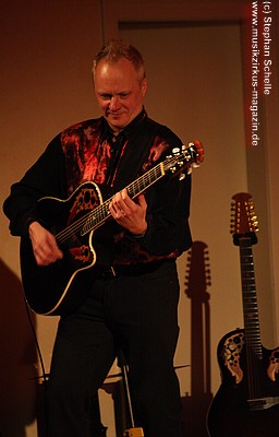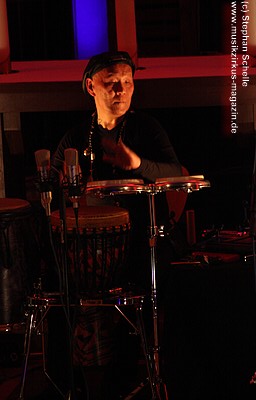 Mit dem ausufernden „Herr der Zeit“ ging dann der erste Teil des Konzertes nach gut einer Stunde zu Ende. Das Stück hatte anfangs stilistische Formen von Weltmusik, was durch die asiatische Stimmung, die durch Mani’s Flötenspiel und Nippy’s Perkussionarbeit hervorgerufen wurde, entstand. Der erste Teil bestand aus Musik die zum abheben, abtauchen oder einfach nur zum Wohlfühlen bestimmt war. Dann folgte ein Part, in dem Ulli seine Gitarrensaiten in bester Genesis-Manier (Steve Hackett bzw. Anthony Phillips ließen grüßen) bearbeitete. Das klang stark nach der Frühphase der britischen Prog-Rock-Legende, die, wie mir Ulli nach dem Konzert verriet, zu seinen Favoriten zählt. Und Nippy sorgt stellenweise mit seinem Triangel-Spiel für besondere Momente. Ich kenne das Instrument von der Schule her und es war mir immer recht eintönig, doch was Nippy mit diesem Gerät für Töne zauberte, war unglaublich. Der Klang der Triangel war streckenweise nicht mehr als solcher zu erkennen.