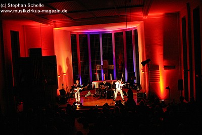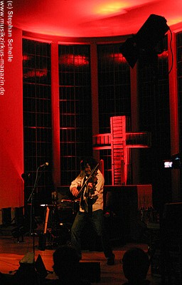 farfarello, die an diesem Abend als Trio auftraten (neben Mani an Geige und Flöten, waren Ulli Brand an der Akustikgitarre und Nippy Noya an Percussion mit auf der Bühne), hatten sich direkt vor dem Altar der Kirche aufgebaut. Das Kreuz auf dem Altar wurde, wie der gesamte Altarraum und die Glasbausteine auf der Altarrückseite sehr ansprechend mit in die Lichtgestaltung eingebunden.