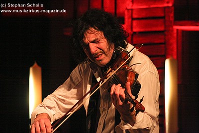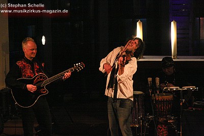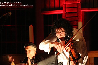 Das Konzert begann dann zunächst verträumt und verspielt mit dem Opener „Weite Felder“. Das Stück ist von einer zarten und atmosphärischen Stimmung geprägt, bei dem alle drei schon mal zeigten, welch Fingerfertigkeit und Musikverständnis sie besitzen. Während Ulli und Nippy aber zunächst recht souverän aber unaufgeregt zu Werke gingen, konnte man bei diesem ersten Stück schon erkennen, das Mani Neumann wirklich die Musik im Blut hat. Er hat das Attribut Teufelsgeiger wirklich verdient, denn er ging förmlich in der Musik auf. Seine Geige entwickelte sich zu einem dritten Arm, der mit dem Musiker zu verschmelzen schien, was sich in einem ekstatischen Spiel, das völlig aus dieser Welt entrückt war, zeigte.
