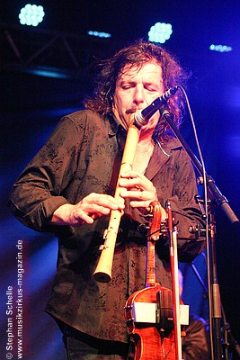 Da in der Vorankündigung als LineUp „Stammbesetzung“ stand und mit dem aktuellen Album „Glück!“ geworben wurde, erwartete ich eine andere, viel rockigere Zusammensetzung – also mit Bass, Gesang und Schlagzeug – als das in Schwerte der Fall war. Gleich beim Eintritt in den Schlachthof überkam mich allerdings ein enttäuschendes Gefühl, denn neben Geige, Flöten und Akustikgitarren fanden sich nur die Bassgitarren von Joschi Kappl auf der Bühne. Von Perkussion oder gar Schlagzeug war leider nichts zu sehen. Also mal abwarten, ob die Band diesen fehlenden Rhythmusgeber kompensieren kann.