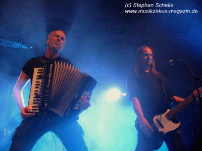 Der Gig machte wirklich eine Menge Spaß. Zur Band gehörten noch Peter Pathos (Gitarre, Gesang), Rainer Schulz (Bass), Tobias Heindl (Geige), Stefan Klug (Akkordeon und Bodhrán) sowie Frank Jooss (Schlagzeug). Doch den Beginn des Gigs machte ein anderer. Ein Roadie trat mit Schafbock-Kopf und Fellbekleidung auf die Bühne und sprang dort mit seiner Handtrommel auf und ab, während die Musiker so langsam die Bühne betraten. Gleich war das Publikum am toben und sollte sich auch über den ganzen Auftritt hin kaum mehr beruhigen.