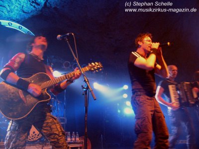 Das Publikum ging so mit, dass durch ihr Gehüpfe die im hinteren Teil angebrachte Tribüne beschädigt wurde. Es hatte sich eine Traverse gelöst bzw. war gebrochen und die Bretter bogen sich schon verdächtig durch, so dass in der Umbaupause nach dem Fiddler’s Green-Konzert die Zuschauer in diesem Bereich die Höhle verlassen mussten. Hierdurch verzögerte sich leider der gesamte Ablauf um fast eine Stunde, was dazu führte, das die nachkommenden Bands ihre Auftritte kürzen mussten. Das war zwar äußerst schade, aber hier geht die Sicherheit einfach vor, das mussten auch die Zuschauer akzeptieren. Insgesamt ist zu sagen, dass die Organisatoren die Lage immer im Griff zu haben schienen und mit viel Fingerspitzengefühl hantierten.