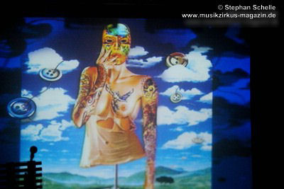Leinwand gezeigt wurden und auf die jeweiligen Songs abgestimmt waren. Zu