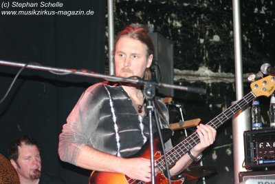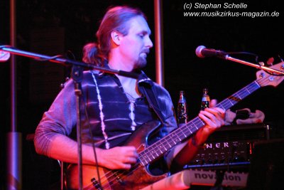 Das Jonas Reingold den Schalk im Nacken hat, das sieht man während eines Konzertes mehrfach. Irgendwie hat der Mann einen ganz coolen, trockenen Humor. In einer für ihn kurzen Pause - die anderen spielten bereits - nahm er nicht nur einen Schluck aus der Wasserflasche, sondern nutzte diese auch gleich als Instrument. Er blies mal eben so aus Langeweile, wie es schien, in den Flaschenhals. Da das in dem Moment ganz gut passte, machte er damit auch gleich weiter, was zur Erheiterung seiner Kollegen und des Publikums beitrug. In einer anderen Situation schlug er gemächlich auf die Saiten seines Basses ein, so wie man das von einem Affen – ist nicht bös gemeint, sah nur lustig aus – kennt, der ein unbekanntes Objekt untersucht. Das hatte auch was von einer kleinen Boxeinlage.