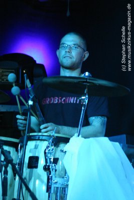 Die einzelnen Bandmitglieder betraten unter großem Jubel die Bühne. Toni Moff-Mollo hatte sich einen neuen Gags ausgedacht und so trat er gleich zu Beginn als „Super-Toni“ in einem Superman-Kostüm auf. War das Fankonzert am 18.05.2007 in Hagen-Hohenlimburg noch die Generalprobe, bei dem ich ebenfalls anwesend war, so stellte das Konzert in Aschaffenburg die Feuertaufe für die „alten“ und die „neuen“ dar. Entsprechend war ihnen zunächst die Anspannung anzumerken, die aber von der Euphorie des Publikums förmlich aus dem Saal geblasen wurde.