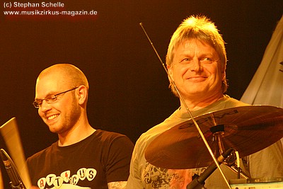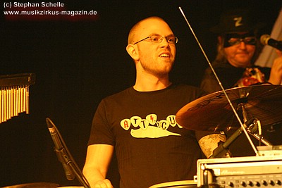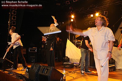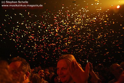 Während dem anschließenden „Merry Green“ machte sich in der Halle ein Geruch von Benzin breit. Hatte man sich vor Konzertbeginn noch über die vielen Feuerwehrmänner, die die Bühne inspizierten, lustig gemacht, kam jetzt ein etwas merkwürdiges Gefühl auf. „Sollte da etwas Ungewöhnliches passiert sein? Was ist, wenn die Jungs jetzt wieder einen pyrotechnischen Effekt zünden?“ dachte ich so bei mir. Doch dann war schnell klar, der Geruch hatte mit der nächsten Showeinlage zu tun, denn zum ersten Mal ließ sich Toni auf einem Motorroller (eine Hommage an seinen selbst gebastelten Shopper aus den 80’ern) zum Stück „Space Rider“ auf die Bühne fahren. Zu diesem Stück ließen sie dann auch noch Konfetti von der Decke regnen. Zu „Powerplay“ wurden dann alle vorgestellt, auch die Mädels und Jungs hinter der Bühne. Mit dem neuen Stück „Another Journey“, das seit dem 2008’er Auftritt in Betzdorf zum festen Programmteil gehört, und bei dem Axel „Felix“ Harlos (er wirkte neben Eroc als zweiter Schlagzeuger auf dem ersten Grobschnitt-Album mit) die Band an den Perkussion unterstützte, endete der dreieinhalbstündige Marathon mit kleinen Geschenken (Poster wurden ins Publikum geworfen) an die Fans.