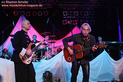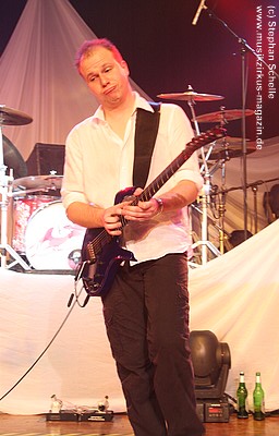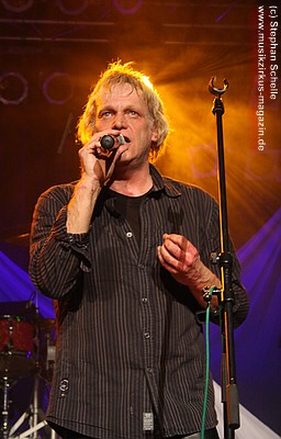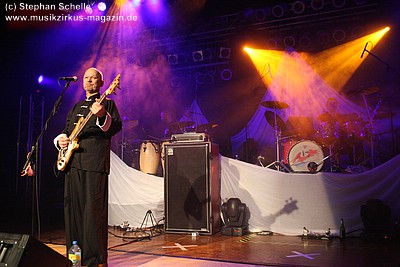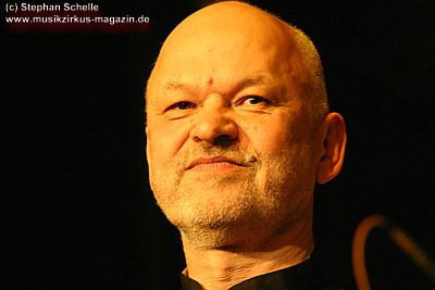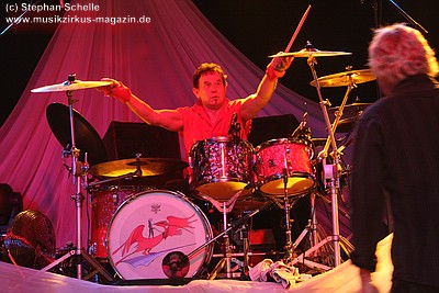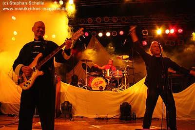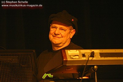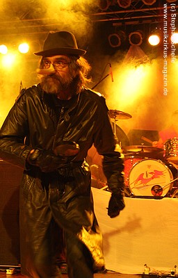 Der zweite Teil begann – wie immer – mit „Komm und tanz“, mit dem Grobschnitt dann nahtlos an den ersten Teil der Show anknüpfte. Bei „The Sniffer“ war Harro wieder in der Rolle des Schnüfflers auf der Bühne unterwegs, bevor dann das Stück, das in keiner Show fehlen darf und auf das alle warten, gespielt wurde. „Solar Music“ in der „Sonnentanz“-Version wurde an diesem Abend noch ekstatischer und ausführlicher gespielt als es bisher der Fall war. Die Soli waren wieder unglaublich. So hatte Nuki wieder andere Passagen parat, Milla mischte mal eben kurz eine Tonfolge und ein „la, la, lah“ aus der „Symphony“ in sein Solo und die Rhythmusgruppe Rolf Möller und Demian Hache spielten sich förmlich in einen Rausch. Allein diese Tatsache machte aus dem „Sonnentanz“ ein Erlebnis.