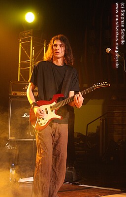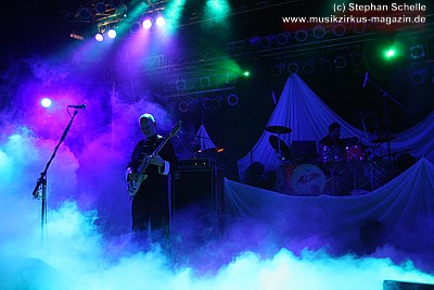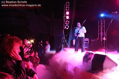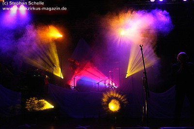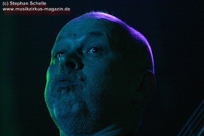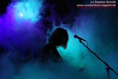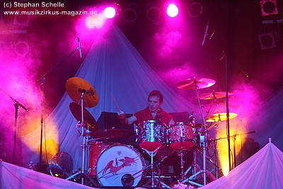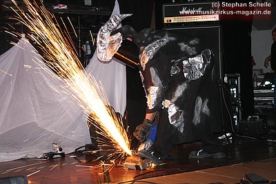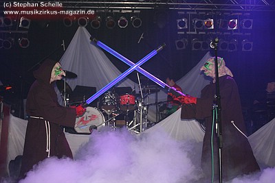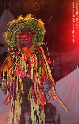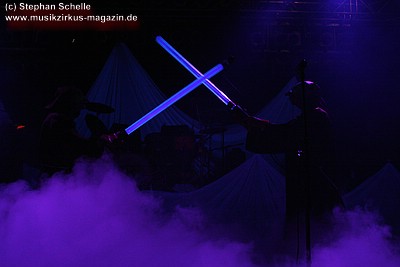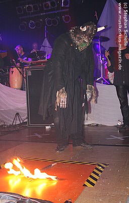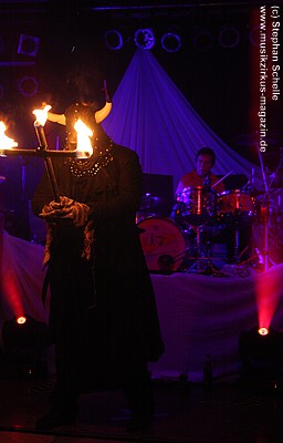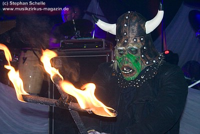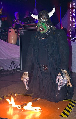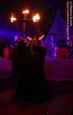 Auch die optische Unterstützung war wieder erste Sahne. Die Winkelschleifer sprühten, der Sonnengott mit seinen beiden Fackelträgern (sie hatten neue Masken und überarbeitete Kostüme) und der Schwertkampf fehlten natürlich auch nicht. Und mitten drin sprang Toni in einem Elefantenkostüm auf die Bühne und röhrte wie wild rum. Doch was dann, nach Beendigung des „Sonnentanzes“ kam, trieb so manchem Besucher die Freudentränen in die Augen. Deva Tattva fing an seinen Tasteninstrumenten an zu spielen und beschwor mit seinem Sound den Spirit der 70’er (ein Hauch von Volker „Mist“ Kahrs, der leider viel zu früh verstorbene Ex-Keyboarder, schien durch den Saal zu schweben), denn es folgte ein Part aus der 78’er Version von „Solar Music“, in der damals immer der Wikinger mit dem Feuerkreuz auf die Bühne kam. Der Rockpalast hat diese Version im Übrigen 1978 in Bild und Ton festgehalten (Liebe Freunde vom Rockpalast: "Wann kommt endlich die offizielle DVD?"). Das ist einfach Kult. Zu dieser Passage betrat dann Ralf Dreger als Wikinger mit dem Feuerkreuz die Bühne und ging langsam und vor Kummer gebeugt - so wie man es aus den 70'ern kennt - zur Bühnenmitte, um in einer Art Zeremonie das brennende Kreuz abzulegen. Wer dies aus den 70’ern kennt, der war sofort emotional berührt. Eine tolle Idee, diesen Showteil wiederzubeleben. Das war eindeutig der emotionale Höhepunkt des Abends.