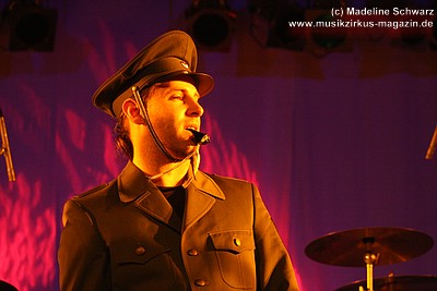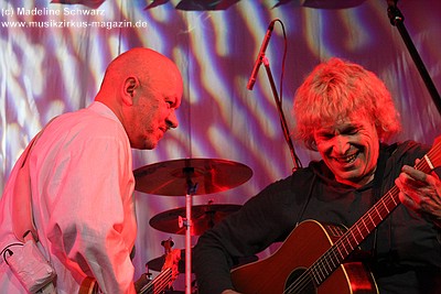 War der erste Teil des Abends eher was zum Zuhören und Träumen, lautet das Motto nun: es darf gerockt werden! Knackig und laut, mit brachialen Powerchords knallt „Razzia“, gefolgt von „Illegal“ ungestüm in den Abend. Die zwei Politkracher um polizeiliche und staatliche Willkür, optisch umgesetzt mit blaulichtbewehrten Helmträgern, die , Schilder und Knüppel im harten Stiefeltakt gegeneinander schlagen, umtost von Sirenenklängen, sind mitreißende Statements, die leider seit ihrer Entstehung nichts an Aktualität verloren haben. Danach erklingt „Vater Schmidts Wandertag“, wieder eine Reminiszenz an die 70er Jahre - ein Stück, das Publikum und Band gleichermaßen lieben, was aus jeder gespielten Note ebenso herauszuhören ist wie aus den Mitsingchorälen der Fans - die Geschichte der Familie, die zwecks Rekreation einen Plastikwald aufsucht, wird beängstigenderweise immer weniger Science Fiction - und da kann man dann nur noch eines dazu sagen: „Wir wollen leben“ - die Demohymne der Band, in Tagen von Waldabholzungen und Kernkraftkatastrophen ein wichtiges Stück Popkultur. Das Lied rockt heute stärker als früher, an Stelle von Synthielinien sind treibende Gitarrenriffs getreten, der Rhythmus powert stärker - das Stück wurde härter für härtere Zeiten.