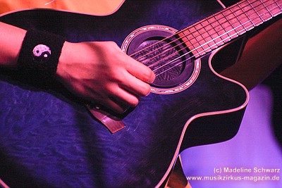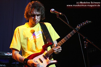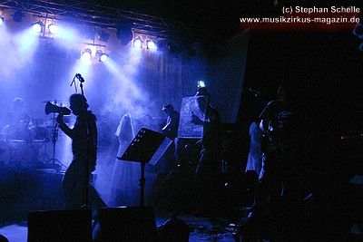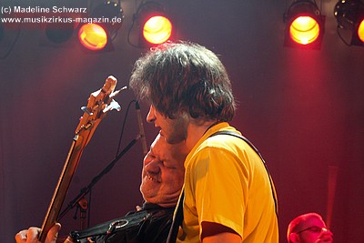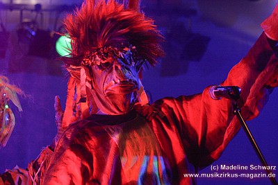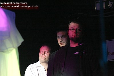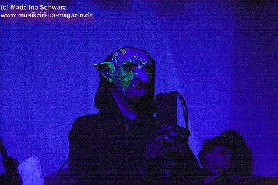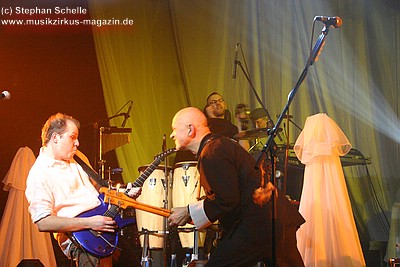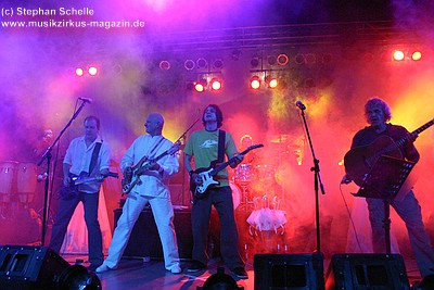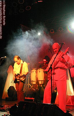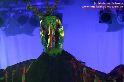 War die Band im Monat zuvor beim Auftritt in Betzdorf von gesundheitlichen und technischen Pannen ein wenig gebeutelt gewesen, legten sie hier nun einen durch und durch mitreißenden Rockevent hin. Das Zusammenspiel der Musiker ist dicht, wirkt wie aus einem Guss - die Gitarristen Nuki Danielak und Manu Kapolke werfen sich die Motive scheinbar mühelos zu, Willi Wildschwein-Danielaks Stimme und Laminatklampfe bilden ein festes Fundament, das Story und Komposition zu jedem Moment zusammenhält. Tatti Tattva an den Keys rollt elegische Klangteppiche aus oder webt feinste Soundmotive ein, während Milla Kapolkes Bass zugleich die Rhythmik vorantreibt aber auch melodisch-solistische Akzente setzt. Die beiden Schlagwerker der Gruppe scheinen nahezu jeden vertrackten Break intravenös zu sich genommen zu haben - anders ist die traumwandlerische Sicherheit kaum zu erklären, mit der Demian Hache und Admiral Top Sahne das vielschichtige Werk von Höhepunkt zu Höhepunkt trommeln. Gerade die leisen Töne zeigen, wie feinfühlig man die Drums einsetzen kann - fast schon als zusätzliches Melodieinstrument. Klar können die beiden Rhythmusleute auch powertechnisch abrocken - aber dafür ist vor allem die zweite Konzerthälfte da. Doch noch befinden wir uns im Reich poetischer Rockfantasie - und hier spielt auch Toni Moff Mollo, neben seinen charakteristischen Vocals, sein Talent als Showmensch an den Lichtreglern voll aus.