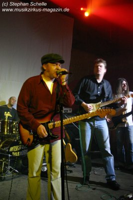 Die Veranstalter ließen gegen 21.00 Uhr, eigentlich sollte die Show um diese Zeit starten, die Zuschauer in Fünfergruppen in die Disco ein, da man ein Gedrängel verhindern wollte (so was hab ich auch noch nicht erlebt). Hab ich schon erwähnt, dass Pink Floyd-Fans friedfertig sind? Der Konzertbeginn verzögerte sich dann noch um eine ganze Stunde und die Band kam mit einem gehörigen Brass auf die Bühne. Den hatten sie aber nicht dem Publikum gegenüber und man spürte das auch nicht, aber Gitarrist und Sänger Pofter erzählte mir das nach dem Konzert. Mit einer Menge Wut im Bauch hauten sie dann ab 22.00 Uhr ’nen ordentlichen Sound raus und gaben ein mitreißendes, fast dreistündiges Konzert, das aus zwei Teilen bestand.