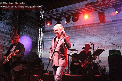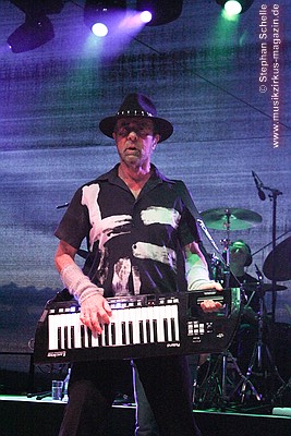 Gegen 21.30 Uhr kam dann Manfred mit seiner Earthband auf die Bühne. Die Band um Manfred Mann (Keyboards, Gesang) stellte sich an diesem sommerlichen Abend wie folgt dar: Robert Hart (Gesang), Mick Rogers (Gitarre, Gesang), Steve Kinch (Bass) und Jimmy Copley (Schlagzeug). Diese fünf Musiker zelebrierten einen Streifzug durch die musikalisch Geschichte der Earthband hoch über dem Ruhrtal. Vom Schlossberg hatten die Gäste einen wunderbaren Ausblick über die Ruhrschleife, die Arnsberg, das Tor zum Sauerland, umspannt.