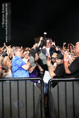 Graben vor der Bühne stieg. Auch diese Aktion wurde von begeisterten Fans