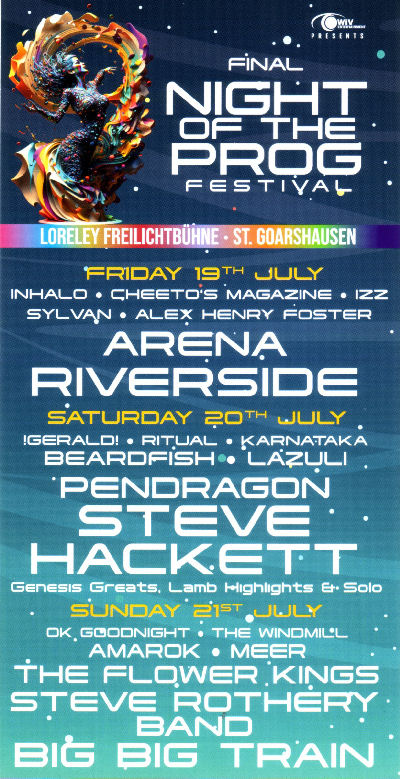 Es spielten am Freitag, den 19.07.2024: Inhalo (Niederlande) Cheeto's Magazine (Spanien) I Z Z (USA) Sylvan (Deutschland) Alex Henry Foster (Kanada) Arena (Großbritannien) Riverside (Polen) Es traten am Samstag, den 20.07.2024 auf: !GeRald! (Frankreich/Großbritannien) Ritual (Schweden) Karnataka (Großbritannien) Beardfish (Schweden) Lazuli (Frankreich) Pendragon (Großbritannien) Steve Hackett (Großbritannien) Und am Sonntag, den 21.07.2024 waren zu sehen und zu hören: OK Goodnight (USA) The Windmill (Norwegen) AMAROK (Polen) MEER (Norwegen) The Flower Kings (Schweden) Steve Rothery Band (Großbritannien) Big Big Train (Großbritannien) |