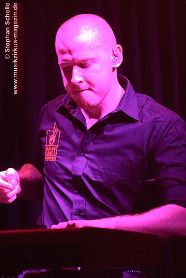 Mit dem Stück „Little Cascade“ kam dann auch noch eine Spur Worldmusic mit in das Set, denn der Rhythmus hatte schon etwas orientalisches und verlieh dem Ganzen eine hypnotische Note. Wer sich jetzt immer noch nicht von der Band angesprochen fühlte, der muss wohl taub gewesen sein. Apropos Rhythmus: Die Rhythmusgruppe aus Schlagzeuger und Perkussionist gefiel mir ausgesprochen gut, denn sie sorgten für einen fetten Sound, wenn sie zusammen agierten. Im ersten Teil kam Paul Jennings mit einem Cajun an den Bühnenrand, auf dem er einen unglaublich fetten Rhythmus hinzauberte.