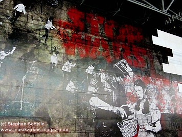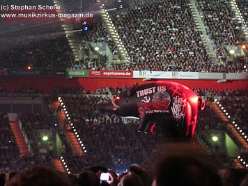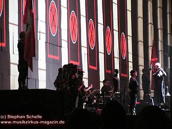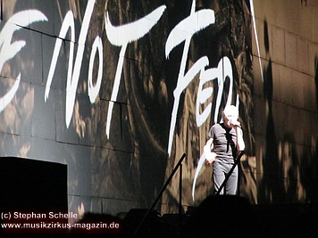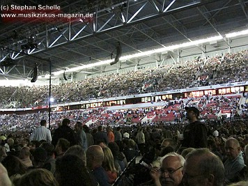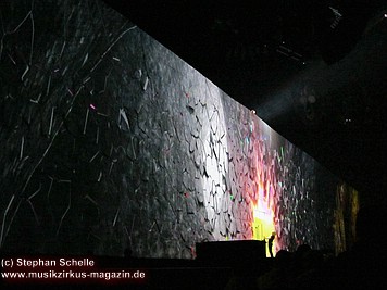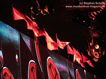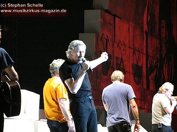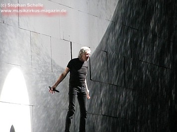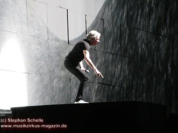 Uniformierte Personen, darunter natürlich Roger Waters, betraten zu Beginn (die Militärs hatten die Puppe dabei) die Bühne und los ging eine gut zweistündige Show, die keine Wünsche übrig ließ. Fahnenschwenkende Statisten, Funkenregen und Feuerwerksraketen, die an die Hallendecke schossen und dann mit einem echt klingenden Absturzgeräusch rauschte die Stuka in die Mauer. So furios begann das Spektakel in der Esprit-Arena von Düsseldorf.