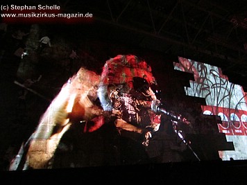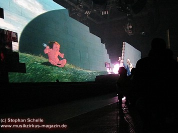 Die von Gerald Scarfe kreierten Figuren, die nicht als überdimensionale Puppen in die Show integriert waren (wie zum Beispiel die Mutter oder der Richter) – zumindest waren sie von meinem Platz aus nicht zu sehen - waren in großen Projektionen auf der Mauer zu sehen. Teilweise hatte ich sogar das Gefühl, dreidimensionale Effekte (wie etwa bei dem Teil, als die Mauer sich aufzulösen schien – und ein Dreieck sich herausdrehte - auf der Mauer bestaunen zu können.