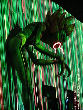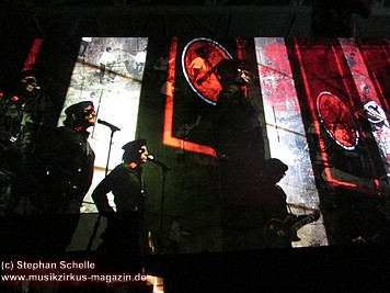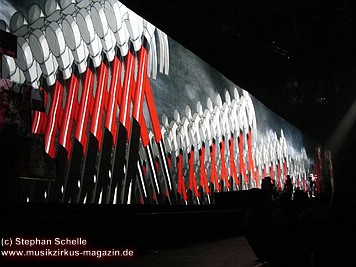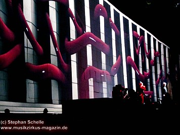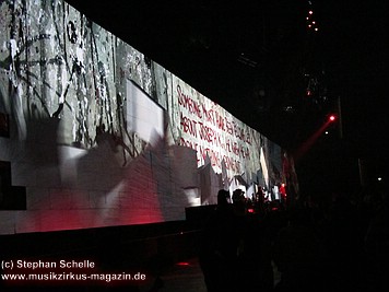 Beim Song „Goodbye Blue Sky“ verdunkelte sich die Mauer und Bomber kamen angeflogen. Aus den Ladeklappen fielen dann sehr schön animierte Zeichen für den Kapitalismus wie zum Beispiel ein Mercedes-Stern, eine Shell-Muschel, Doller- und Euro-Zeichen (sie kamen in roter Farbe auf dem grauen Hintergrund sehr gut zur Geltung). Und so stieg dieses Rot wie Blut an und nahm die ganze Fläche ein. Und zu „Don’t Leave Me Now“ stand plötzlich die überdimensionale Ehefrau (ganz in grün) mit ihren leuchtenden Augen und Lippen vor der Bühne. Das war schon ein imposantes Bild. Zumal die Farbspiele auf der Mauer so gut animiert waren, das man sie nicht als Projektionen wahrnahm. Es wirkte förmlich so, als flössen Farbstreifen die Wand herunter.