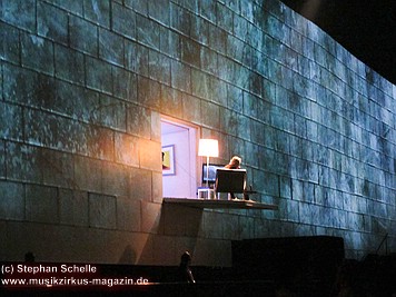 Nach der Pause startete Roger mit „Hey You“, zu dem lediglich die Mauer in einem Grauton erstrahlte. Zu Beginn von „Is There Anybody Out There?“ gingen Suchscheinwerfer durch das Publikum, was eine bedrückende Stimmung erzeugte, so als würde nach jemandem gesucht. Bei „Nobody Home“ klappte eine Seite aus der Mauer und man sah Roger in der bekannten Hotelzimmer-Szene, wo er in einem Stuhl vor einem Fernseher sitzt (mit der Stehlampe daneben). Das war noch einmal ein sehr eindrucksvoller Showteil. Aber was schreibe ich, das Gesamtkunstwerk war beeindruckend, und zwar ohne Abstriche. Das eindringliche „Bring The Boys Back Home“ wurde durch große Lettern auf der Mauer eindrucksvoll unterstrichen.