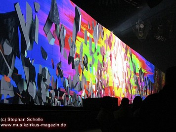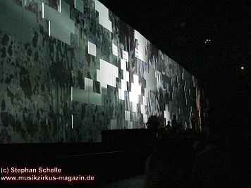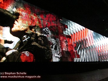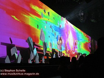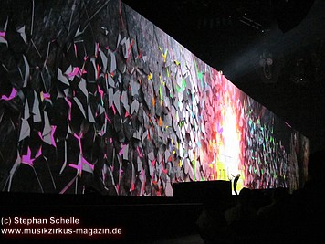 An den Seiten der mittleren weißen Mauersteine, auf denen die aufwendigsten Projektionen gezeigt wurden, waren bunte – wie angemalt wirkende – Teile der Mauer fest angebracht. Auf diesen wurden Livebilder von der Show projiziert, die allerdings durch den farbigen Untergrund – zumindest aus der Nähe - nicht so deutlich waren. Man konnte aber zumindest einen Teil der Show auch von der Seite genießen.