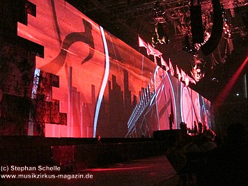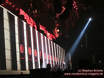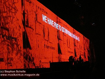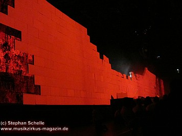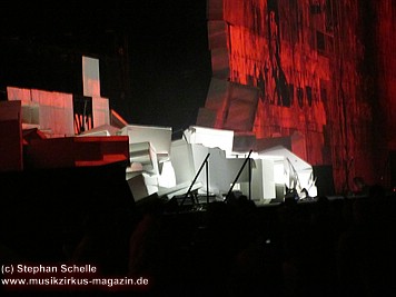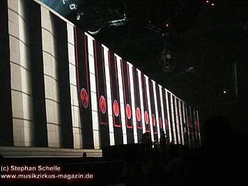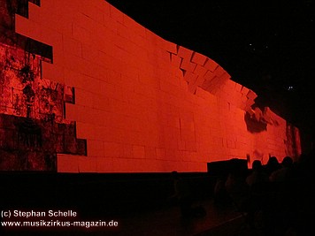 Der Großteil der Bühne war bereits durch die Mauersteine bedeckt. Nur in der Mitte war noch ein Keilförmiger Spalt geöffnet, durch den man die Band bei den ersten Stücken agieren sehen konnte. Darüber war die von Pink Floyd bekannte runde Leinwand angebracht.