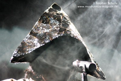 Ganz in schwarz und mit einer ebenfalls schwarzen Gesichtsmaske bekleidet kam Yogi dann zum Stück "The Shadow" auf die Bühne. Während des Songs agierte er auch als Schatten von Kalle und Werner, in dem er sich hinter sie platzierte und die Bewegungen seiner Kollegen synchron mitmachte. Und zu "The Wise In The Desert" wechselte Yogi dann in einen weißen Umhang mit überdimensionalen Augen auf dem Stoff unter den Achseln.