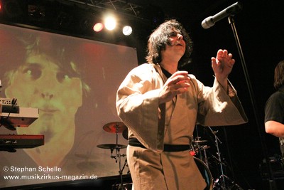 Markus und Marc nahmen hinter ihren Instrumenten Platz und Kalle und Werner platzierten sich hinter den Leinwänden, die sie als Schatten zeigten, da sie von hinten angestrahlt wurden. RPWL starteten ein fulminantes Konzert, dass mich sofort in seinen Bann zog. Dann kam Yogi Lang in einer Judo-Robe und einem dreieckigen Hut, der mit Spiegelstücken besetzt war, auf die Bühne. Yogi schlüpfte an diesem Abend noch in zahlreiche Kostüme.