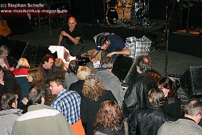 Der Bühnenaufbau war recht schlicht, kein Firlefanz zu sehen, sondern lediglich die Instrumente waren aufgebaut. Etwas irritierend war kurz vor Konzertbeginn der Verkauf von CDs und Merch-Artikeln direkt vom Bühnenrand. Dies wiederholte sich am Ende des Gigs, war aber wohl nicht anders möglich, da ein Verkaufsstand aufgrund der nachfolgenden Disco-Veranstaltung in der Zeche wohl zu aufwändig gewesen wäre.