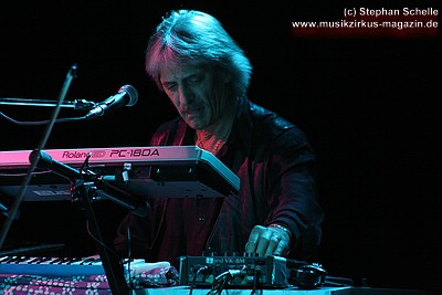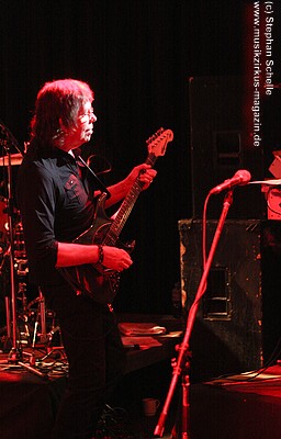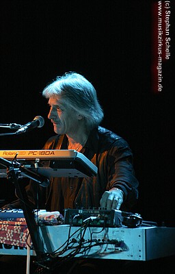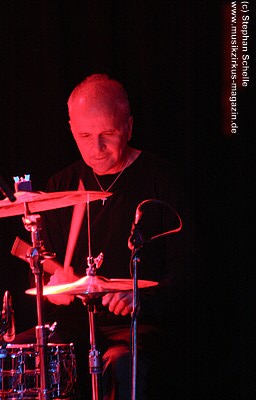 Während Steve die Band vorstellte, gab es einen kurzen Exkurs in die Welt der Vinylscheiben und CDs. Denn, wie Steve bemerkte, konnte man auf den LPs wenigstens die Credits lesen und muss sich nicht die Augen verderben weil der Grafiker auf der CD den Text mal wieder in kleiner gelber Schrift auf weißem Untergrund platziert hat. Er stellte besonders heraus, dass es ihm eine Freude ist wieder mit Stuart Elliott zu spielen, mit dem er bereits vor 38 Jahren die Band gründete. Und schon war er bei seinem Alter bzw. dem Alter der Besucher, bei dem er doch einige ausmachte, die sogar älter waren als er.