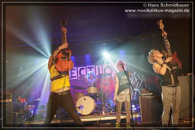 kurzerhand den Bass im Spagat spielte, kam das Publikum aus dem Staunen