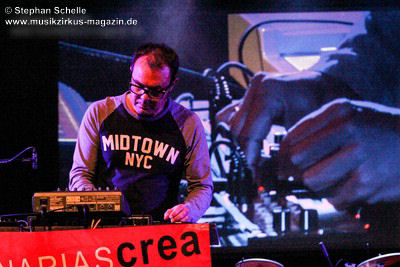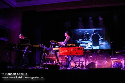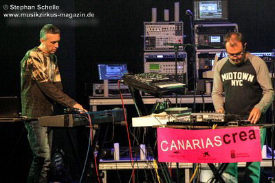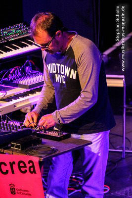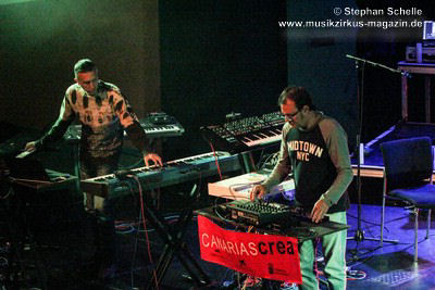 Miguel und Javi agierten sehr homogen auf der Bühne und zeigten sich musikalisch mit einem blinden Verständnis. Da merkte man dass diese beiden Musiker schon oft zusammengespielt haben. In ihre Musik woben die beiden Sounds, die an Tangerine Dream und auch Klaus Schulze erinnerten und versetzten sie mit rhythmischen Pattern aus dem Sequenzer. Während Miguel an seinen Gerätschaften drehte, bediente Javi die Tasten seiner Keyboards und ging dabei oftmals sehr filigran und mit großer Fingerfertigkeit zu Werke. Mehrfach spielte er dabei gleich zwei seiner Tasteninstrumente gleichzeitig. Gerade er war es, der jazzige Versatzstücke in die Musik integrierte.