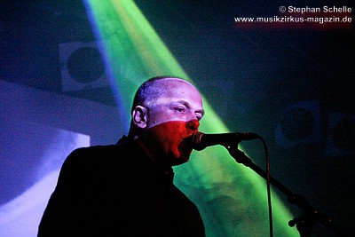 Bühnenmitte um entweder einen durch Computer verzerrten Gesang