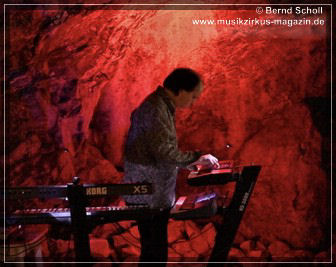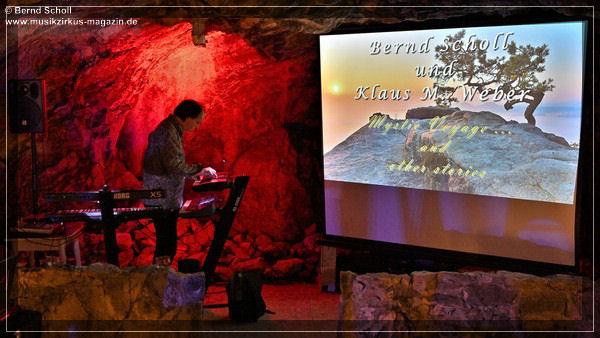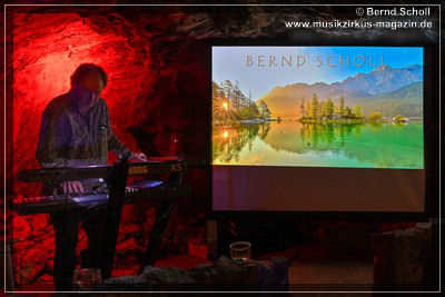 Wer Bernd Scholl kennt, weiß, dass er nicht einfach nur Musik macht. Er entführt seine Zuhörer immer wieder mit seinen Klanglandschaften in andere Welten. Und falls das eigene Kopfkino nicht ausreicht, haben er und sein Projektpartner Klaus M. Weber wieder ein Multimedia-Event auf die Beine gestellt, das so ziemlich einzigartig ist. Aus Tausenden von Fotos hat der Bildkünstler Klaus M. Weber eine Collage zusammengestellt und mit der Musik von Bernd synchronisiert. Das Ganze ist so harmonisch, dass man gar nicht ahnt, wie viel Arbeit dahinter steckt, für jeden Sound und für jede Melodie die passenden Fotos zu finden und thematisch in Szene zu setzen. Aber da die beiden schon seit Jahren ein eingespieltes Team sind, ergänzen sich Musik und visuelle Effekte perfekt. Zum Auftakt hat Bernd einige Titel aus seinem Album „Mystic Voyage“ aus dem Jahr 2000 gewählt, wie um noch einmal in der Zeit zurück zu gehen und von vorne anzufangen, die Erinnerungen schweifen zu lassen und alles Negative der letzten 2 Jahre zu vergessen. Mit „Roof Of The World“, „Shamanic Journey“ und „Tibetan Ritual Ceremony“ , natürlich passend mit Fotografien aus Tibet, fühlte man sich auf die Gipfel des Himalaya versetzt und konnte, untermalt von Gong und Mönchs-Chorälen förmlich die dünne Luft der Annapurna oder des Mount Everest spüren. So haben uns Bernd und Klaus wieder einmal auf eine musikalische und visuelle Weltreise mitgenommen. Mit spektakulären Bildern aus dem Mikro- und Makrokosmos, eingehüllt in teilweise symphonische Klänge und Melodien war die Welt „da draußen“ tatsächlich nach ein paar Minuten vergessen.