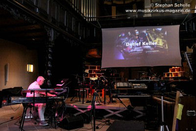 Wie Detlef uns zu Beginn erklärte, wollte er uns auf eine Reise von mehr als 30 Jahren seiner musikalischen Aktivitäten mitnehmen. Dafür hatte er eine Bilderschau aus Fotos, Artikeln und Filmausschnitten mitgebracht, die an die rückwärtige Leinwand projiziert wurden. So sah man ihn schon als Kind an einem Klavier, in seinem Studio (was sich über die Zeit weiterentwickelte), im Probenraum, bei den ersten Konzerten Solo sowie mit seinen musikalischen Mitstreitern Bas Broekhuis und Mario Schönwälder. Und diese Konzerte brachten ihn auch über die deutschen Grenzen hinaus u. a. nach Großbritannien und die USA. Und auch humorvolle kleine Filme die mit Broekhuis und Schönwälder entstanden, waren zu bestaunen.