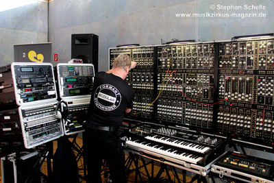 Das Rahmenprogramm im Foyer des Detmolder Sommertheaters bestand aus den Ständen der verschiedenen Label, einer Plattform des Electronic Music Webzines EMPulsiv, auf dem Stefan Erbe einige Musiker interviewte, einem Stand von der Firma Roland, an dem man Synthesizer ausprobieren konnte sowie dem riesigen Formant, einem modularen Synthesizer-System das von Siegfried „Siggi“ Brückner gebaut wurde. Wer die riesigen Synthwände von Klaus Schulze kennt, der kann sich vorstellen, wie beeindruckend dieses wahre Monstrum aussieht.