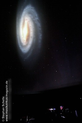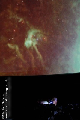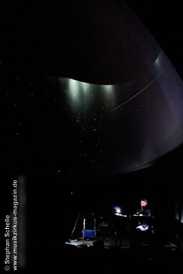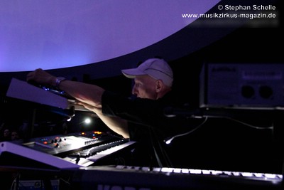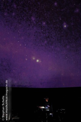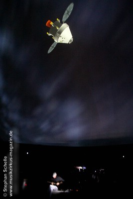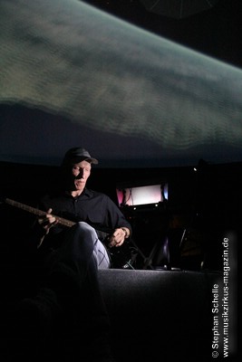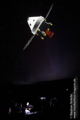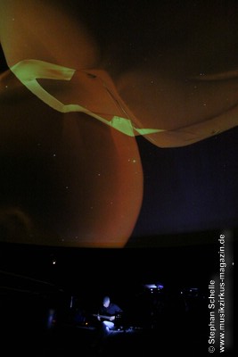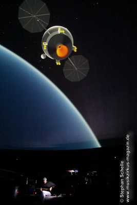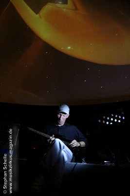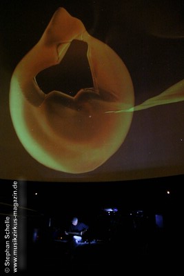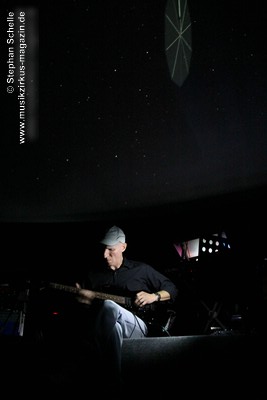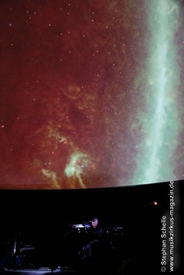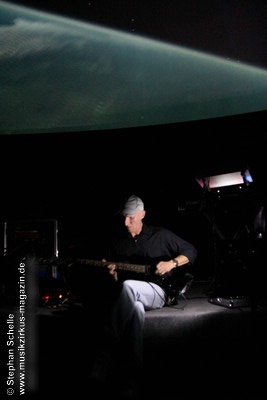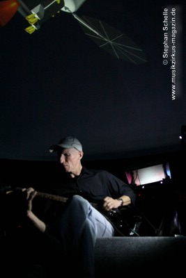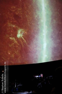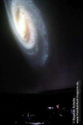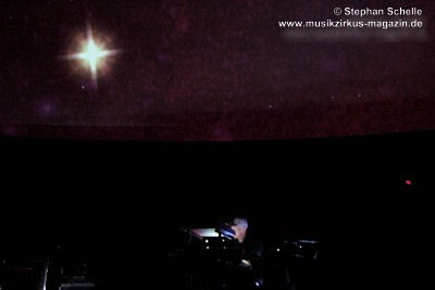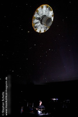 Nach einem Intro startete Frank in das erste Stück „Cry Of The Bell“, das bisher unveröffentlicht ist. Obwohl auch hier zunächst einige Sternenkonstellationen an der Kuppel zu sehen waren, wurde schnell deutlich, dass bei Frank’s Auftritt mehr Animationen wie zum Beispiel Planeten, Kometen oder Satelliten zu sehen sein würden. Das lag sicherlich auch daran, dass seine Musik etwas rhythmischer, melodischer und rockiger angelegt war, als die von Wolfram Spyra. In seinen Stücken waren immer wieder Zitate von Tangerine Dream oder Mike Oldfield herauszuhören.